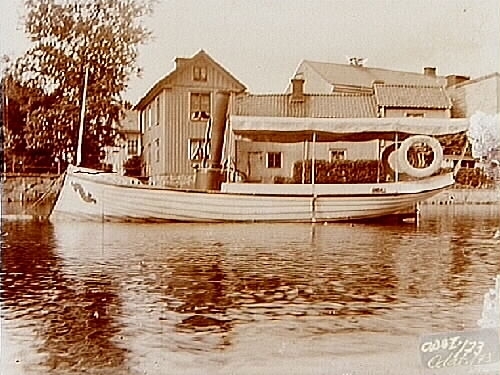 Svartån, en liten ångslup, så kallad "kolibribåt", båtens namn är Selinda. I bakgrunden Wallinska gården, Olaigatan 22.