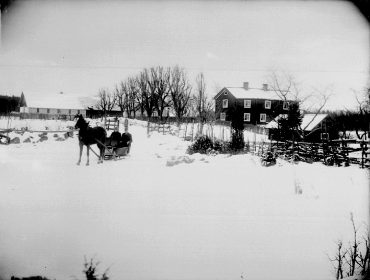En häst spänd för släde med två personer i.