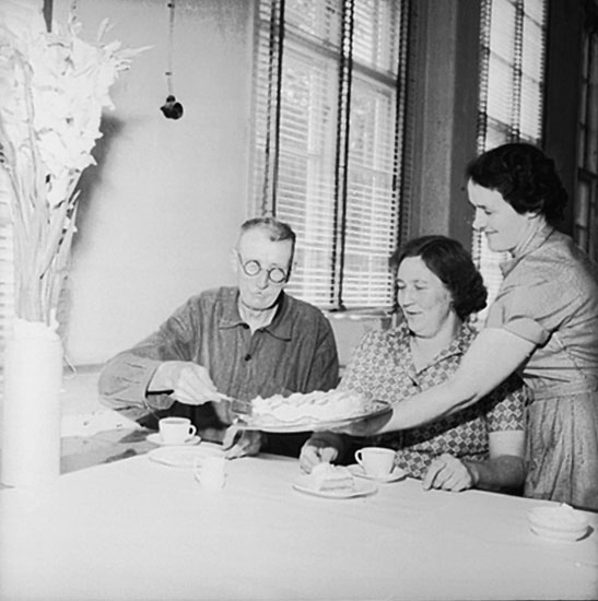 Titel: Verkstadsinteriör, grupp vid bordet, avskedsfest för Kalle Wärnberg.