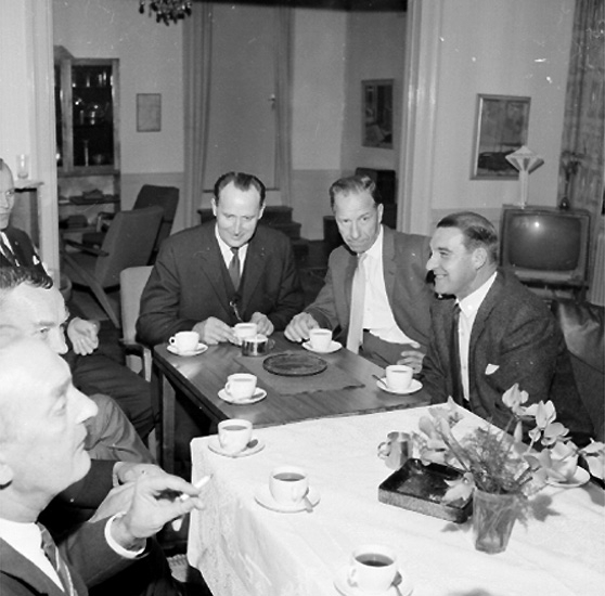 Titel: Rumsinteriör, grupp vid bordet. UB, 30-årsjubileum.