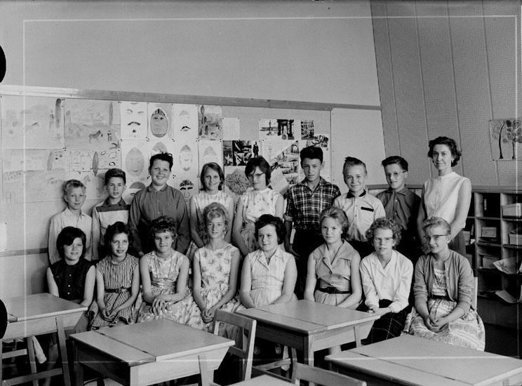 Vasaskolan, klassrumsinteriör, 16 skolbarn med lärarinna fru Margareta Berg.