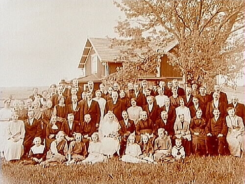 Bröllop. Brudpar, prästen och bröllopsgäster. Bruden helt i vitt, med lång slöja, myrtenkrona och brudbukett. Brudgummen i bonjour och hög hatt. Bostadshus i bakgrunden.