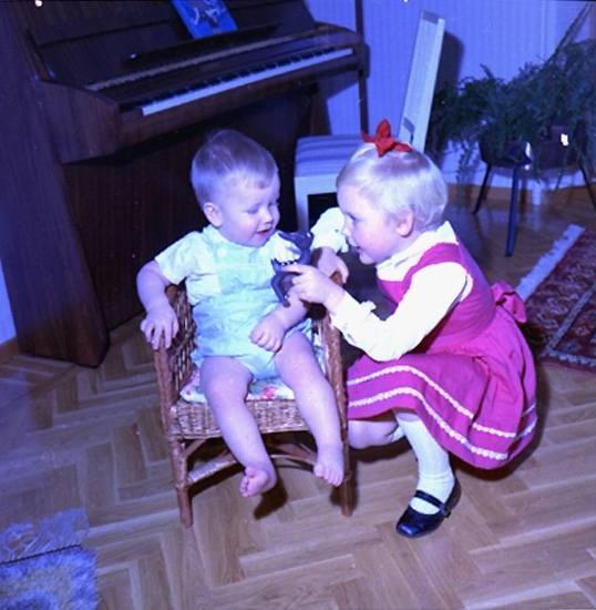 Rumsinteriör, två barn vid pianot.