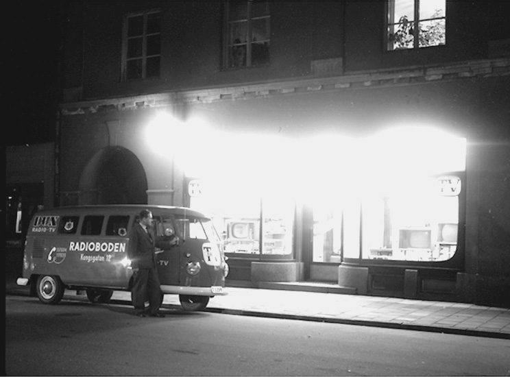 TV-Radioboden, affärsbyggnad, en bil, en man.