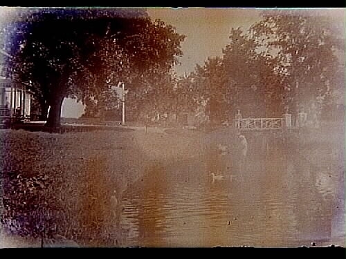 Tvåvånings bostadshus, bron över ån, dammen med fåglar i, en man med hund på bron.