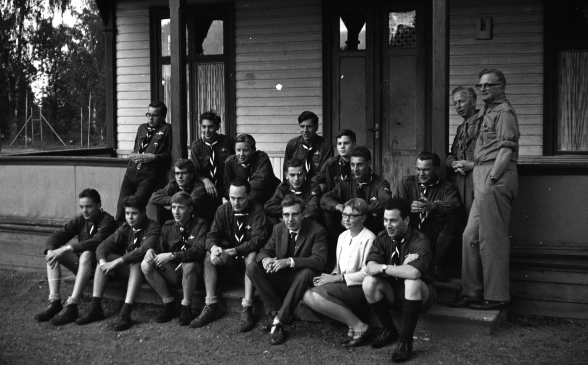 13 scouter har kommit från Berlin för att fotvandra från Örebro till Borlänge. KFUM Wandervögel. Gruppen sitter på förstutrappan utanför ett vandrarhem.