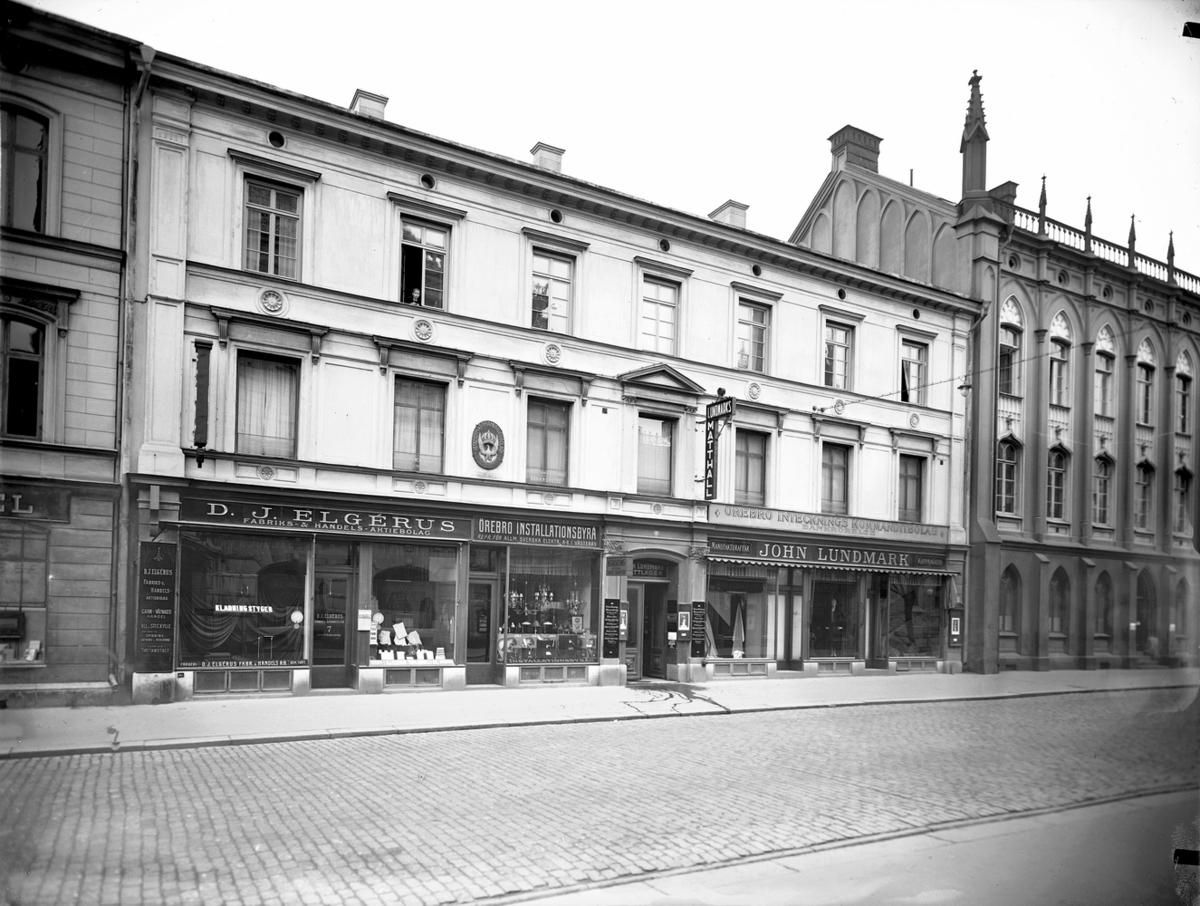 Trevånings stenhus med affärslokaler i gatuplanet. D.J. Elgérus Fabrik & Handels AB. Örebro Installationsbyrå. John Lundmark manufaktur & kappmagasin.