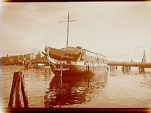 Fregatten Norrköping i hamnen, Sveriges sista krigsfartyg i trä. Har till för ett år sedan varit logementsfartyg för skeppsgossekåren vid Marstrand. Insamling av medel pågår för restaurering av fartyget, som sedemera kommer att inredas till museum.