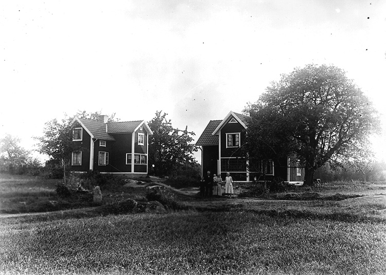 Två bostadshus. Familjegrupp fem personer framför huset.