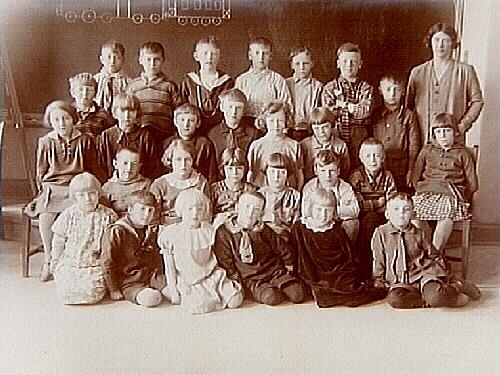 Engelbrektsskolan, klassrumsinteriör, 26 skolbarn med lärarinna fru Elsa Linderholm, sal 21.