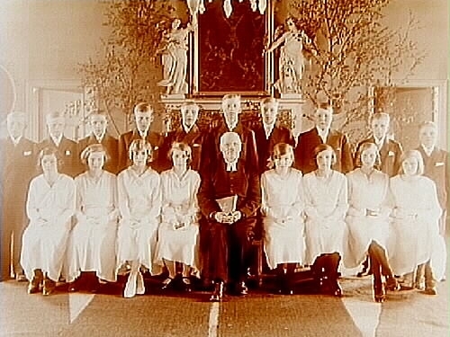 Konfirmander, 8 flickor, 10 pojkar och pastor Thorman framme vid koret i kyrkan.
