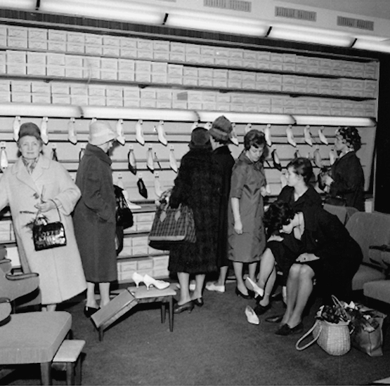 Titel: Oscarias nya affär, skoaffärsinteriör, kunder och personal.