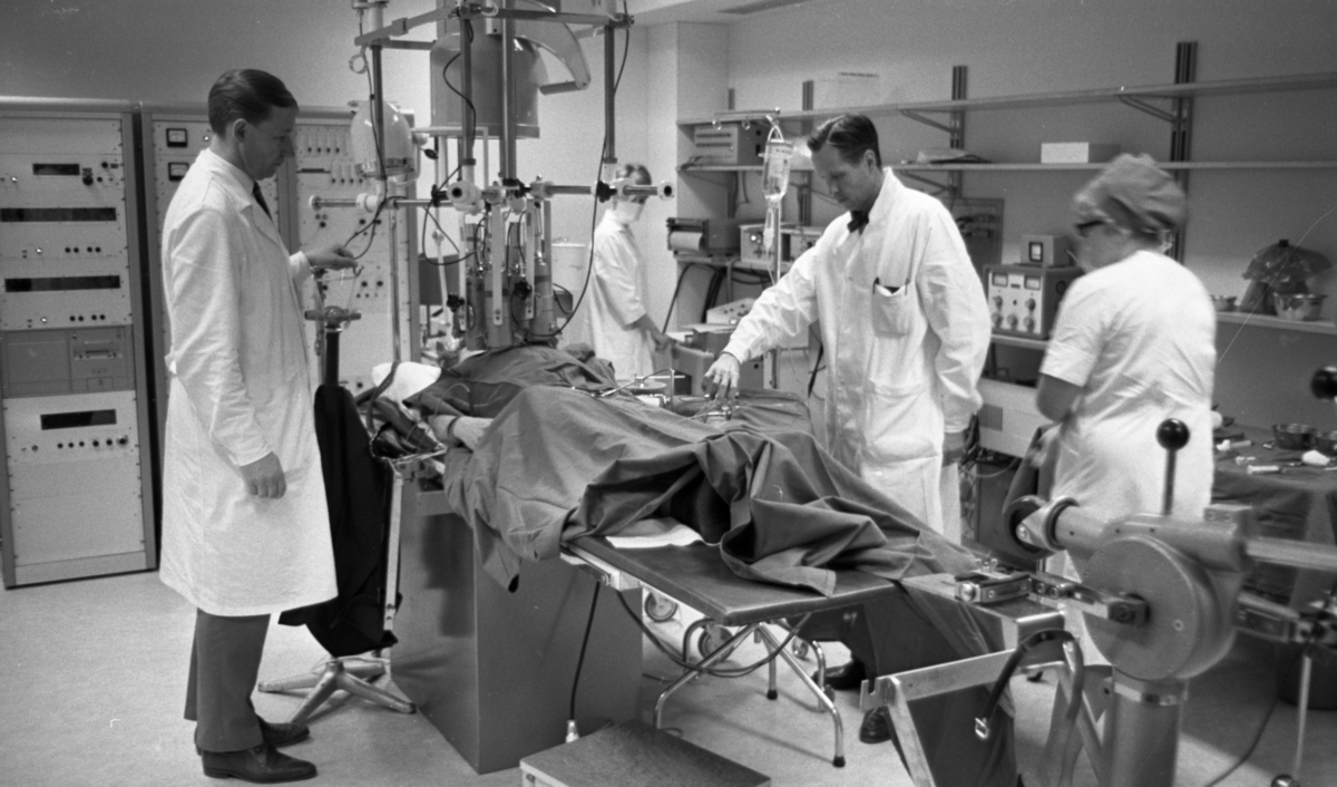 En läkare klädd i vit läkarrock, vit skjorta, mörk slips, svarta byxor och svarta skor står invid en stor medicinsk undersökningsapparat som är riktad mot en kvinnas mage. Hon ligger på en operationssäng under apparaten. Till höger syns en till arbetsklädd läkare. Två kvinnor -sjuksystrar- står också runt kvinnan och är klädda i vita kläder. En av dem bär en operationsmössa på huvudet. Den andra sjuksystern bär munskydd.