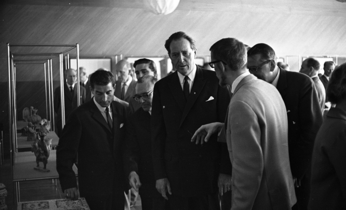 Italienska utställningen i Medborgarhuset med bl. a. landshövdingen Valter Åman och Viterbos borgmästare Luigi Crescia. En samling herrar står i utställningslokalen och beser antika föremål med knytning till vinhantering från gamla Etrurien.