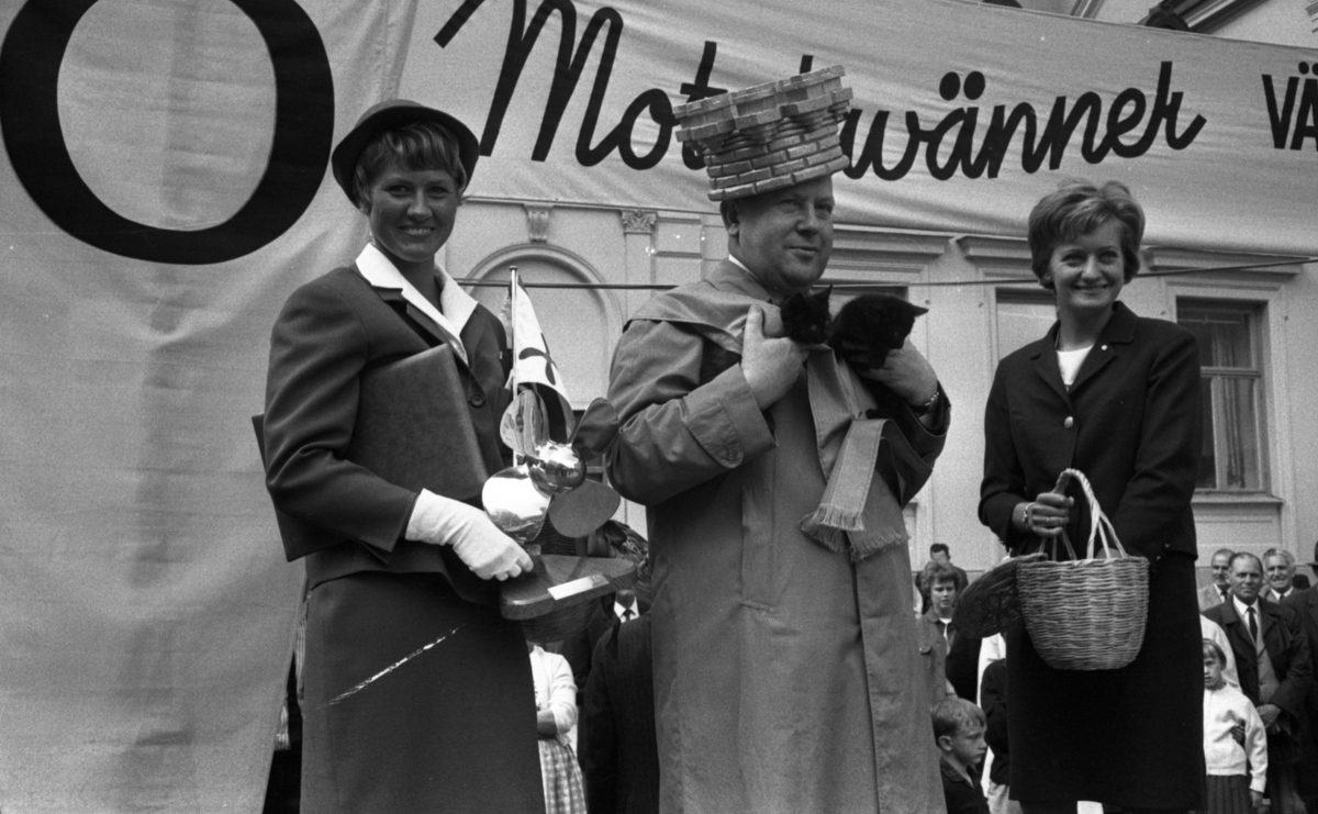 Harald Aronsson stående på en scen med krona på huvudet samt två kattungar i famnen. Två värdinnor står på ömse sidor om honom varav den ena har ett pris i form av en propeller samt en flagga i händerna. Den andra värdinnan håller i en korg. Publik i bakgrunden.