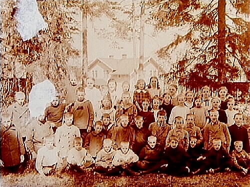 Glashyttans skola, 41 skolbarn med lärarinnan Walborg Ekman.