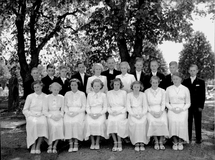 Stora Mellösa konfirmander, 10 flickor, 8 pojkar och pastor Henriksson.