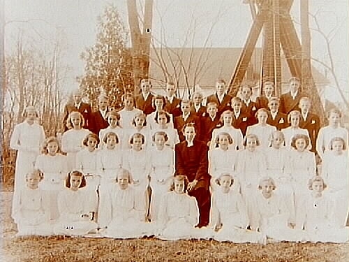 Konfirmander, 28 flickor, 14 pojkar och pastor Gottberg.