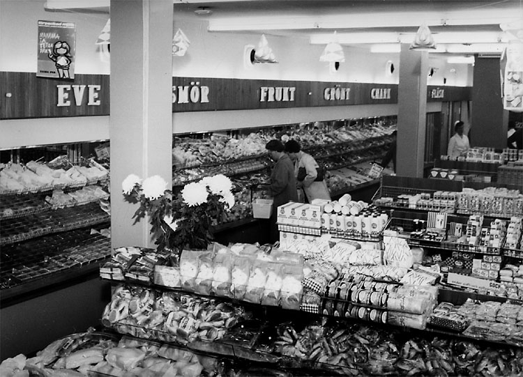 Titel: Konsum, affärsinteriör med kunder och personal.