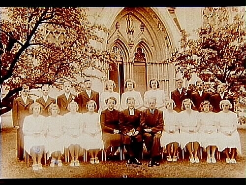 Konfirmander, 11 flickor, 7 pojkar och pastor Areskog.
