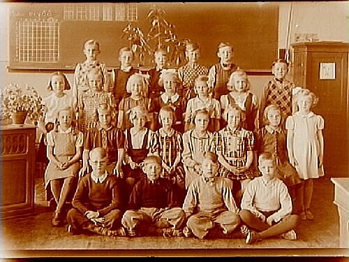 Vasaskolan, klassrumsinteriör, 24 skolbarn med lärarinna fröken Ella Jansson, klass 2, sal 3.