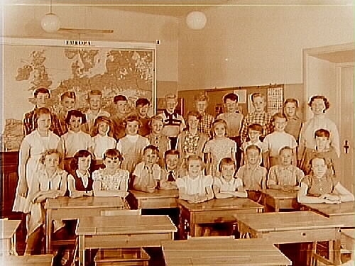 Almby Östra skola, klassrumsinteriör, 30 skolbarn med lärarinna fröken Birgit Dahlström, klass 4 0o, sal 9.