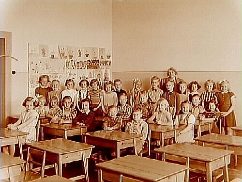 Olaus Petriskolan, klassrumsinteriör, 27 skolbarn med lärarinna fröken Edla Andersson, klass 2a, sal 17.
