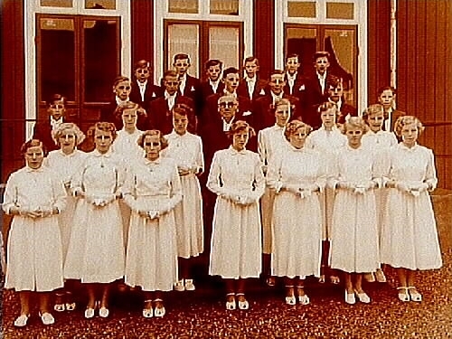 Konfirmander, 13 flickor, 13 pojkar och kyrkoherde Gunnar Johansson.