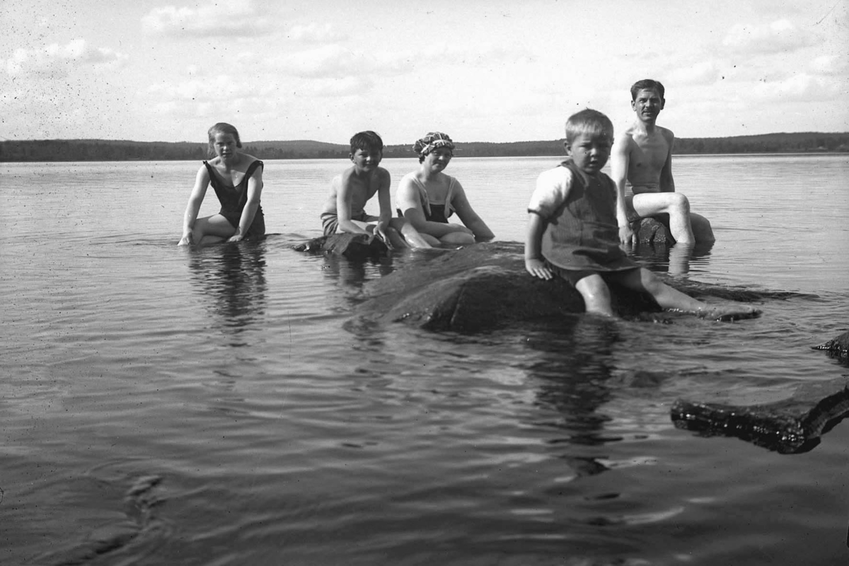Tre barn och två vuxna badar i insjö.