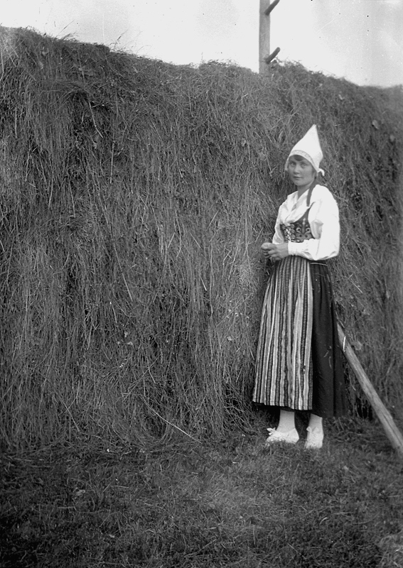 En kvinna i folkdräkt vid höhässjan.