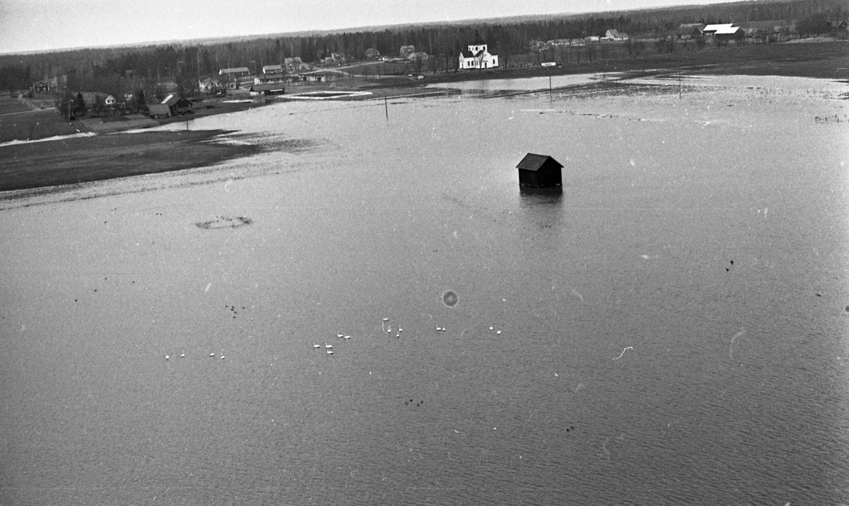 På en översvämmad åker ser man svanar, och ett litet skjul.