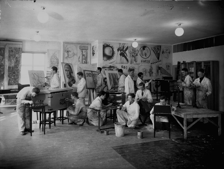 Örebro Yrkesskola, interiör av målarskolan, 14 pojkar som målar och dekorerar.