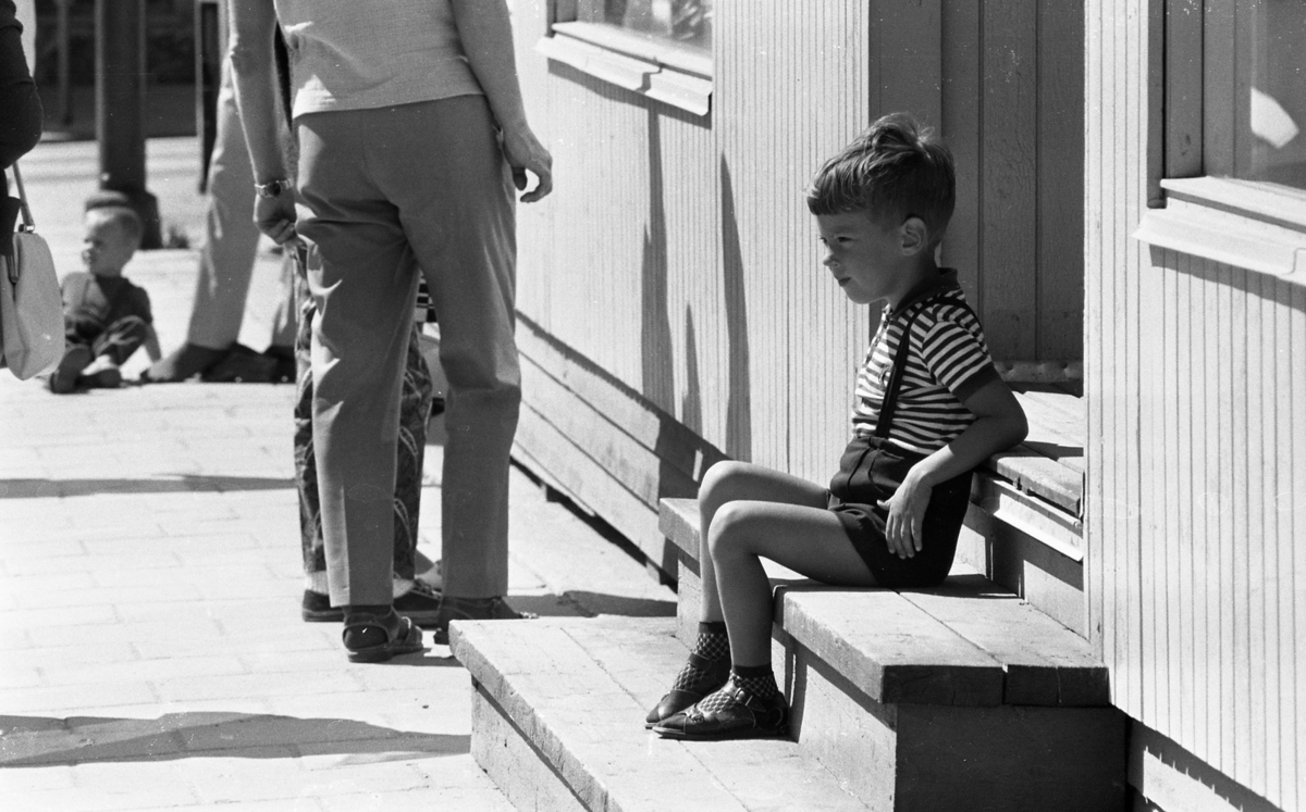 Ett antal människor befinner sig i centrala stan i Örebro. Närbild på en liten pojke i fyraårsåldern klädd i svarta hängselshorts, randig T-tröja, mörka strumpor och mörka sandaler som sitter på en liten trappa. Ytterligare en liten pojke sitter längre bort i bakgrunden. Vuxna människors ben syns på bilden även.