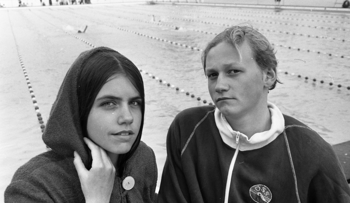 Två simmare står framför en bassäng. Den ena har en luva över håret och båda är klädda i idrottskläder. Personen till höger har en jacka med bokstäverna "ÖSS" på.
