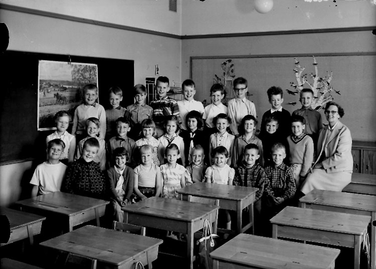 Klassrumsinteriör, 28 skolbarn med lärarinna.