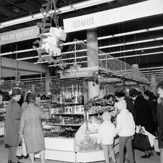 Konsum Domus, affärsinteriör, kunder och personal. Juldisk.