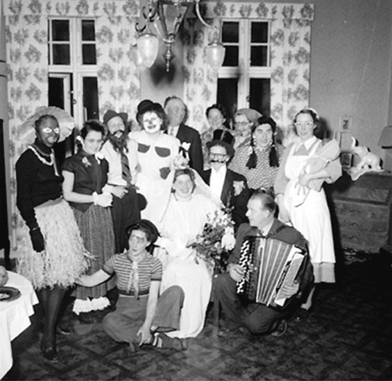 Rumsinteriör, grupp 13 utklädda personer, möhippa.