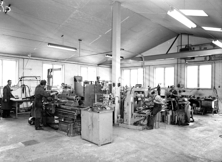 Titel: Stellana Laxå, verkstadsinteriör med arbetare. Sedells (beställare ?).
