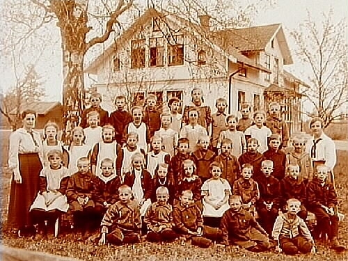 Ökna skola, 41 skolbarn och 2 lärare. En och en halvvånings skolbyggnad i bakgrunden.
