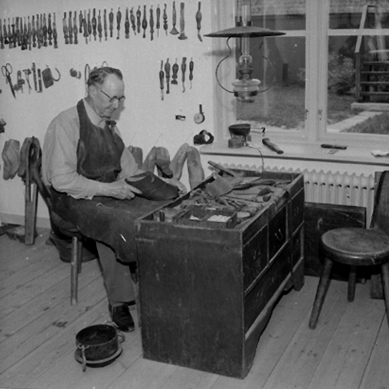 Skomakare i Wadköping, interiör, skotillverkning, en man.