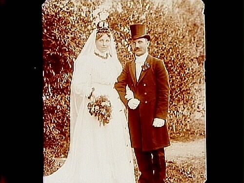 Brudpar, bruden i vit klänning, slöja och krona, brudgummen i frack och hög hatt.