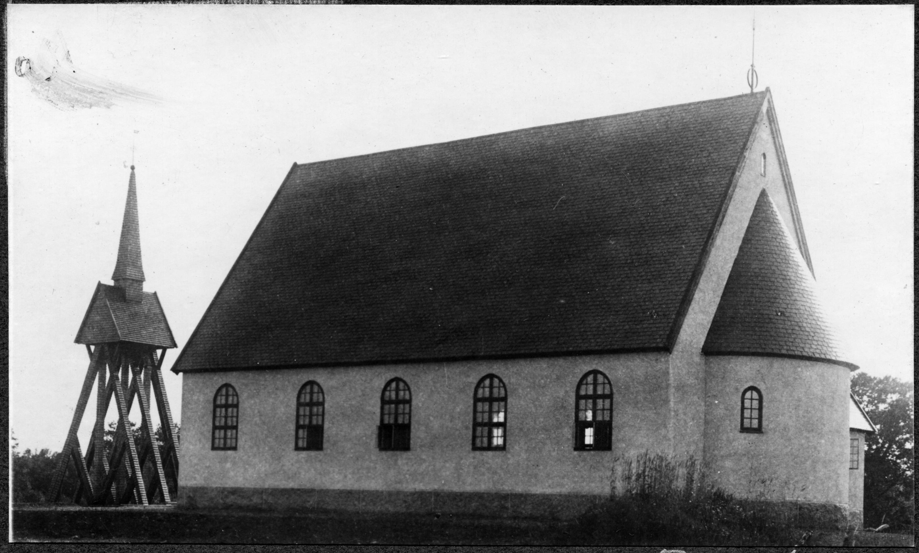Kyrka och klockstapel från sydöst.