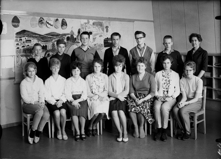 Vasaskolan, klassrumsinteriör, 14 skolbarn med lärarinna fru Margareta Berg.