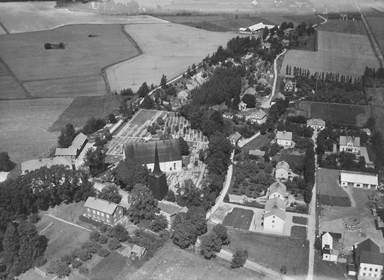 Flygfoto över Sköllersta, kyrkan och bostadshus.