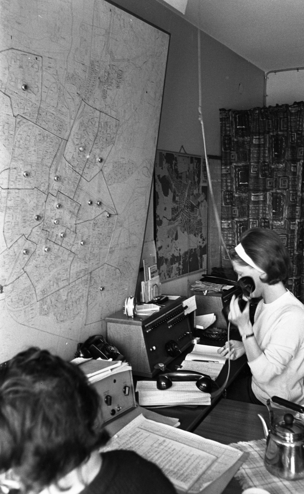 Två kvinnor sitter i en ledningscentral på Taxi. En karta hänger på väggen.
