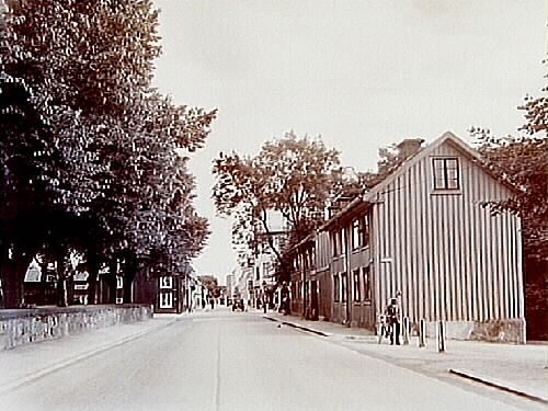 Tvåvånings bostadshus i trä. Hörnet av Drottninggatan och Södermalmsgatan.