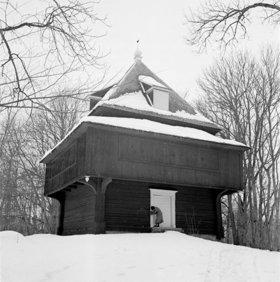 Bystad (Bysta) den 23 mars 1937. På en kulle en bit öster om Bystad herrgård ligger en gammal fatbur. Här syns fatburen på den snöklädda kullen i närbild. Fatburen är kvadratiskt formad och har ett sluttande tak åt fyra håll. På det sluttande takets topp finns en liten lökkupol med en spira. En människa står och öppnar eller stänger den vita dörren till fatburen.