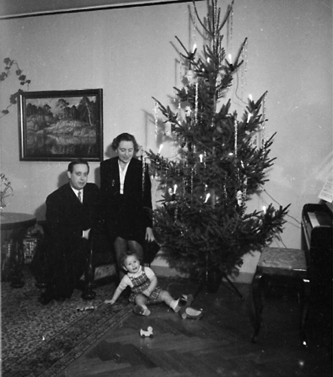 Rumsinteriör, familjegrupp tre personer vid julgranen.