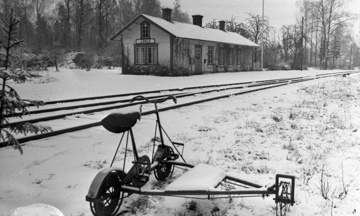 Järle station en snöig vinterdag. En dressin står i förgrunden. Järnvägsspåren syns nära den.