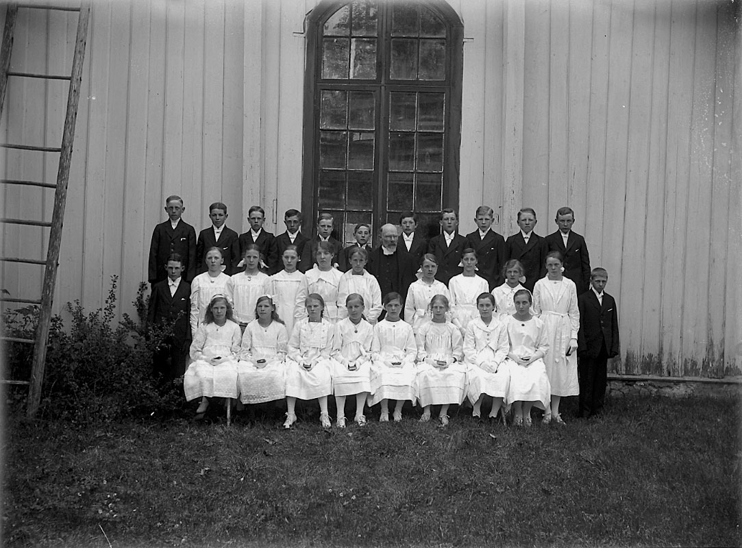 Titel: Konfirmation, konfirmander och en präst. Kyrkobyggnad.